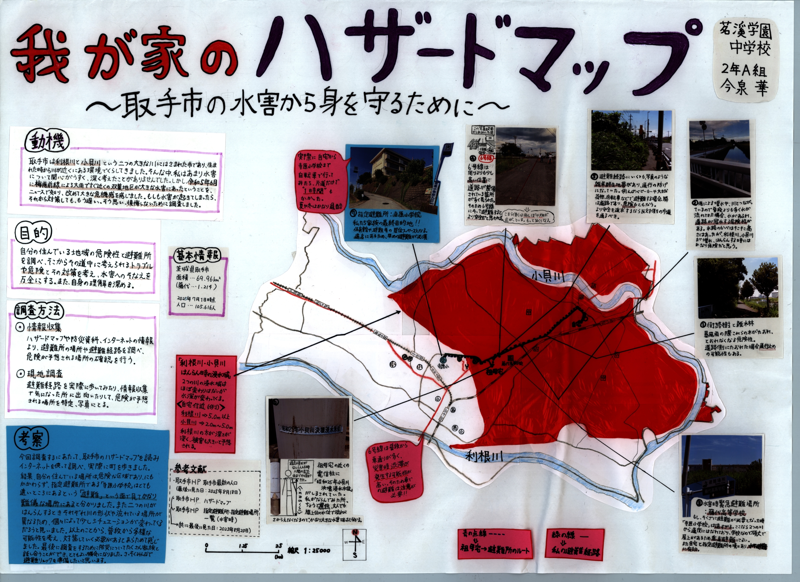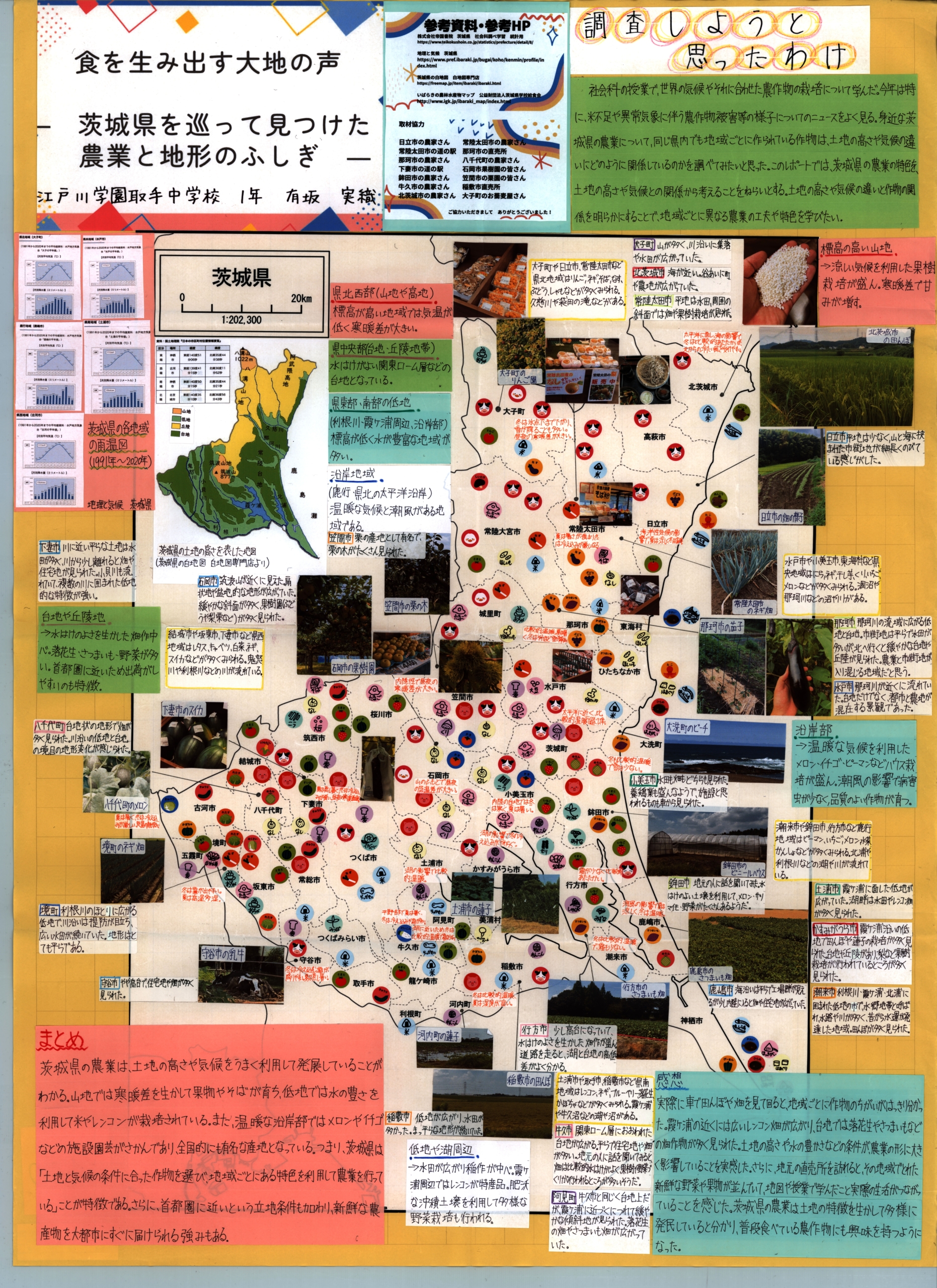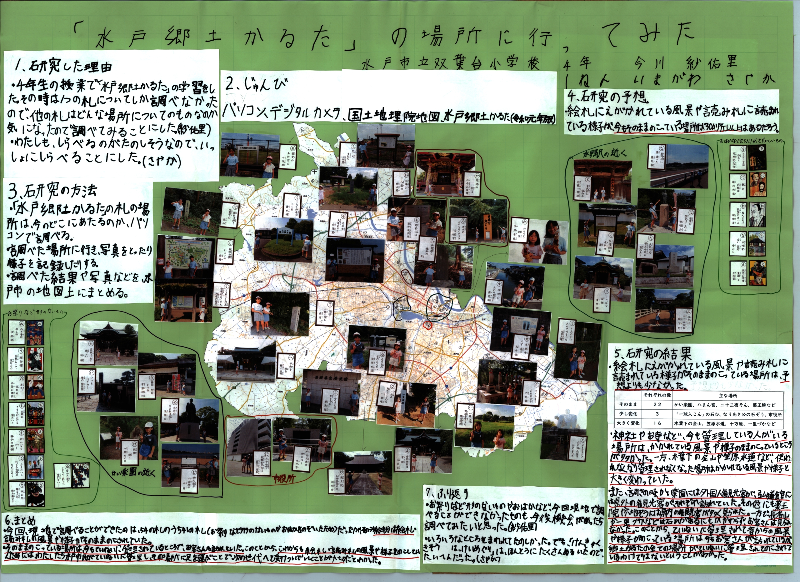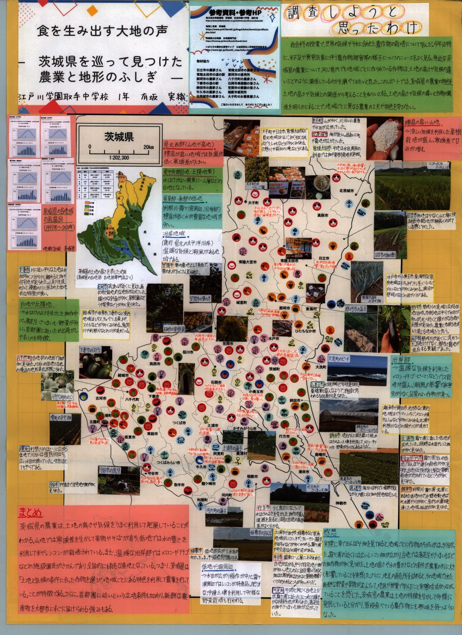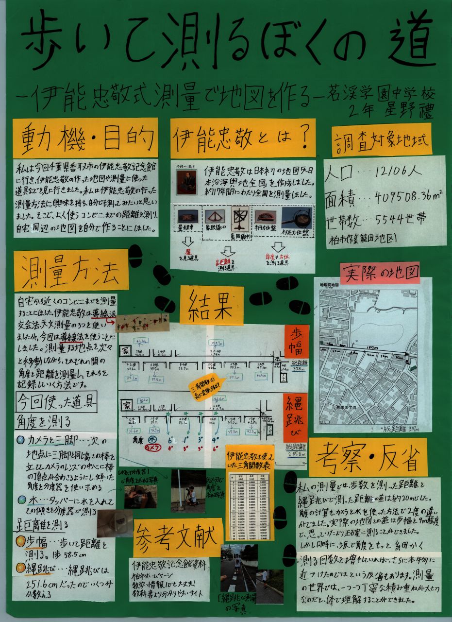 地図作品とは、身近な地域や市町村、県などを対象に、日常の疑問や気づきをもとにテーマを設定して、自ら観察・調査してわかったことや考えたことを表現したものです。テーマは、町づくり、防災、交通、環境、史跡など多岐にわたります。現地調査や聞き取り、文献やインターネットによる調査などさまざまな方法を駆使して取り組み、その成果を模造紙に地図と文章、それに図表や写真なども用いてまとめています。